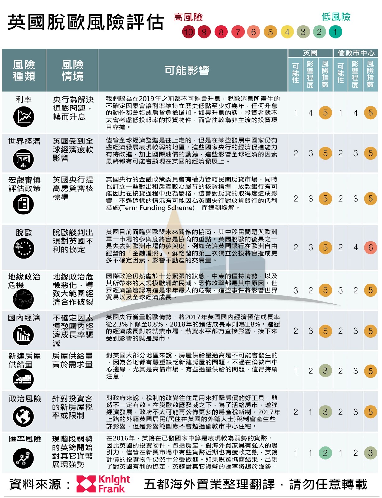 由於英國脫歐後,各媒體對於英國脫歐議題討論得沸沸揚揚,今天五都海外置業特別整理出了英國脫歐風險評估的資料,分享給大家參考。若看不清楚圖片,請點選