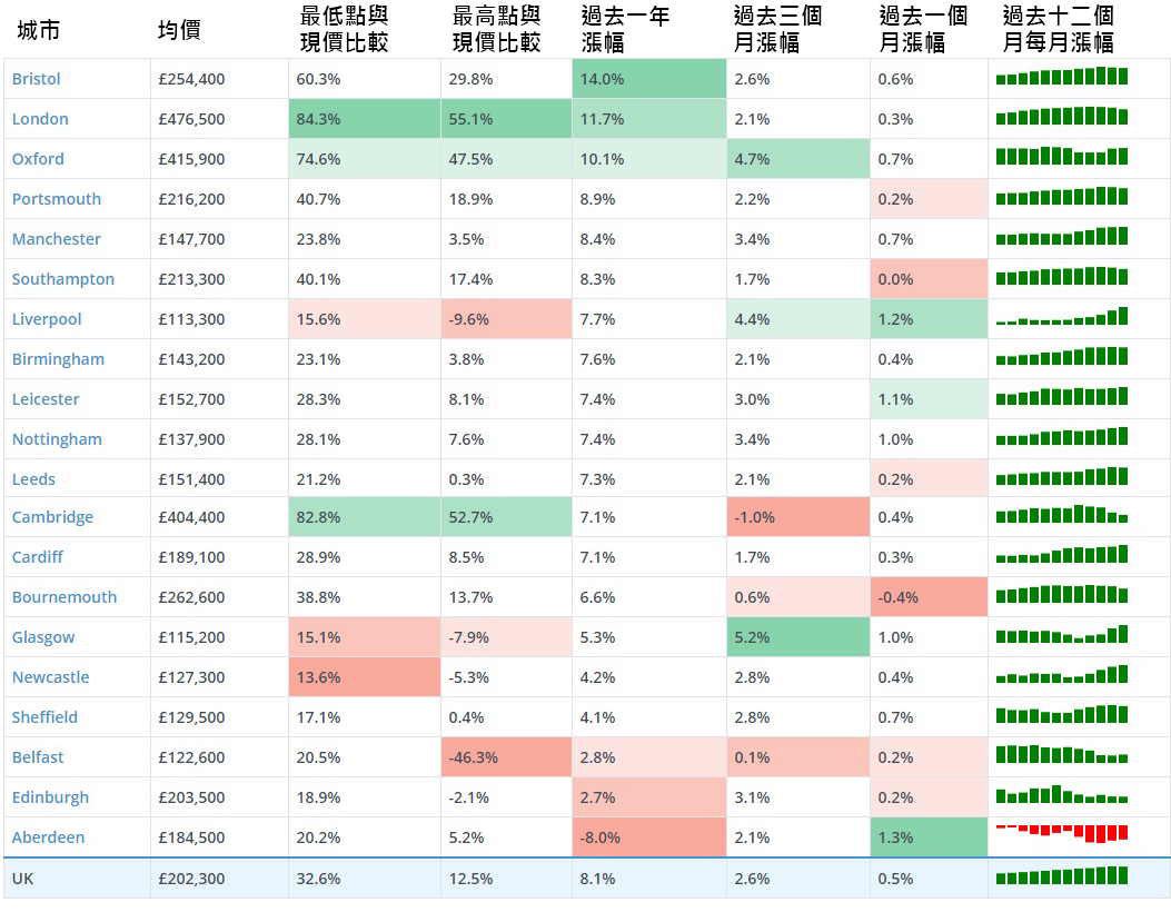 圖三:過去1年、3個月、1個月各大英國城市房價漲幅
