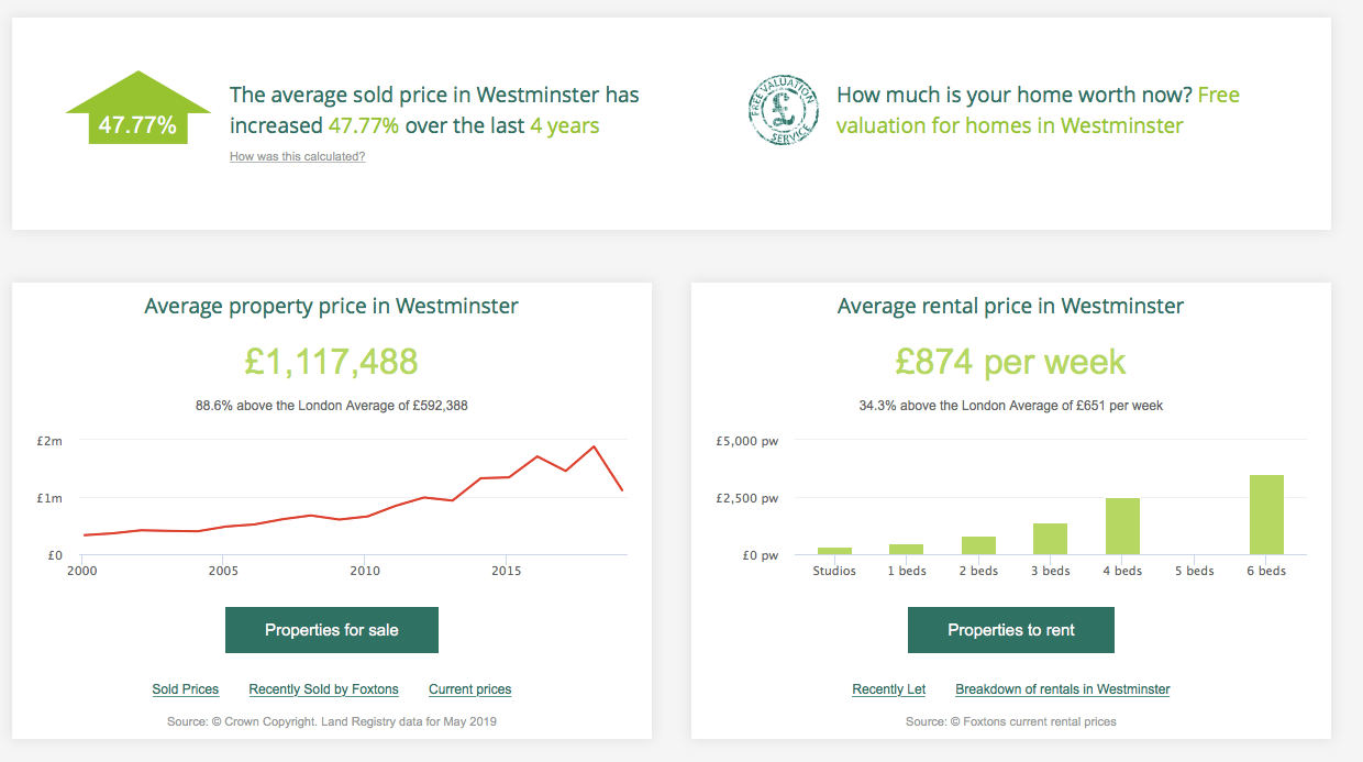 總體而言,西敏寺屬於觀光及政府行政區域,此區的平均房價為£1,117,488,高於倫敦平均房價£592,388 ( 2019數據 ) 約 1.8倍。